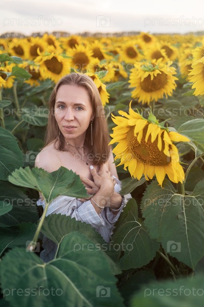 Портрет красивой женщины, позирующей в поле с подсолнухами