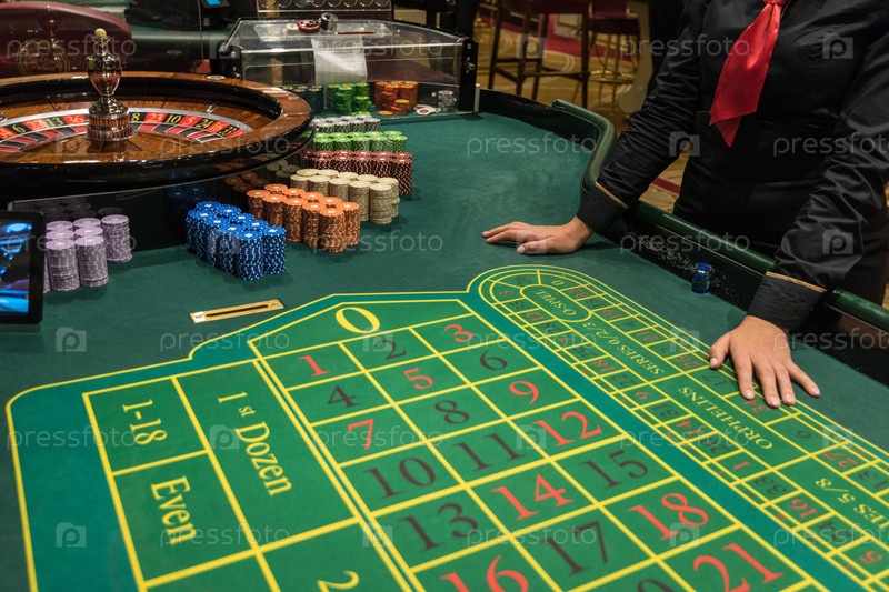 Концепция казино, азартных игр и развлечений - стол рулетки и стопка покерных фишек