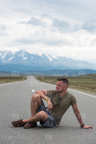 Молодой человек сидит на дороге в районе Чуйского тракта. Республика Алтай, Россия
