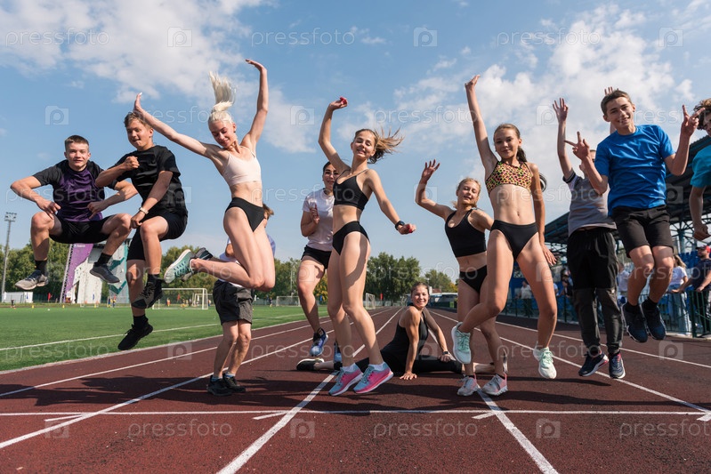 Группа молодых спортсменов тренируется на стадионе