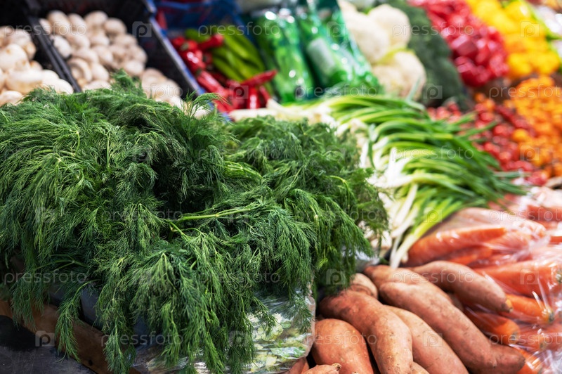 Ассортимент свежих овощей на рынке, зелень на переднем плане