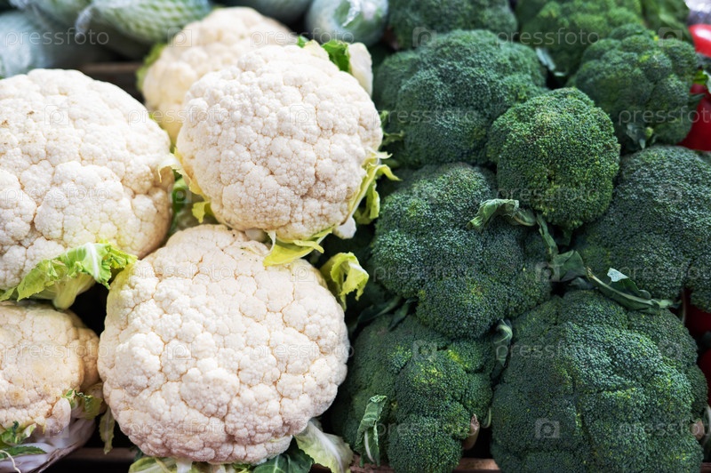Овощи на рынке - цветная капуста и брокколи