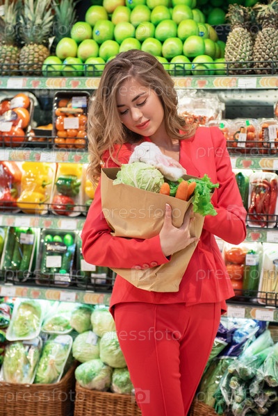 Молодая красивая женщина делает покупки в супермаркете, чтобы купить овощи для своего домашнего белого кролика
