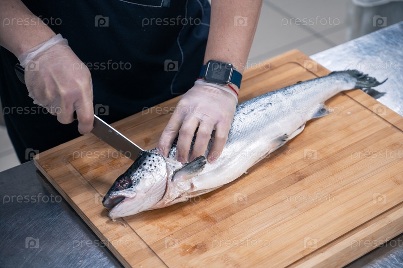 Шеф-повар готовит лосося, потрошая и разделывая его на кухне