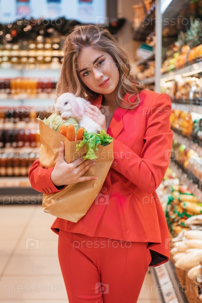 Молодая красивая женщина делает покупки в супермаркете, чтобы купить овощи для своего домашнего белого кролика