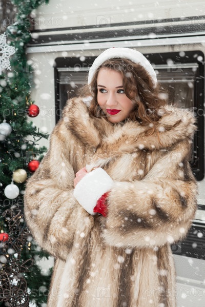 Красавица в шубе в зимнем кемпинге готовится к Новому году