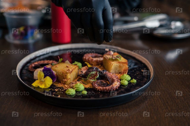 Шеф-повар готовит осьминога с картофелем на гороховом пюре