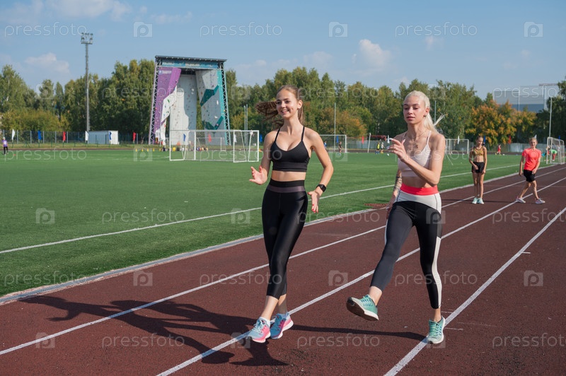 Группа молодых спортсменов тренируется на стадионе