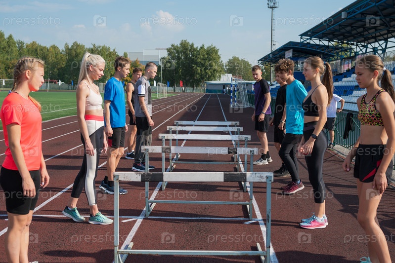 Группа юных спортсменов тренируется на стадионе. Школьные физкультурные тренировки или легкая атлетика