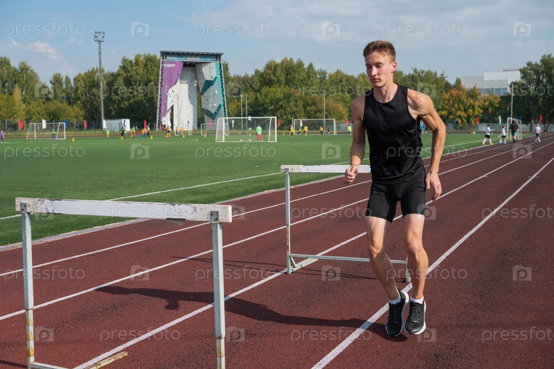 Молодой спортивный мужчина-спортсмен-бегун в растяжке спортивной одежды