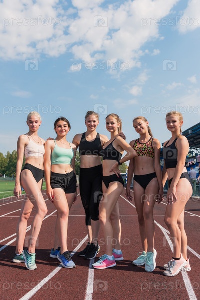 Группа молодых спортсменов с тренером на стадионе. Школьные физкультурные тренировки или легкая атлетика