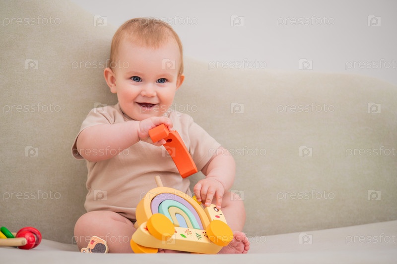 Ребенок сидит на диване, а перед ним игрушечный грузовик. Он улыбается и машет руками
