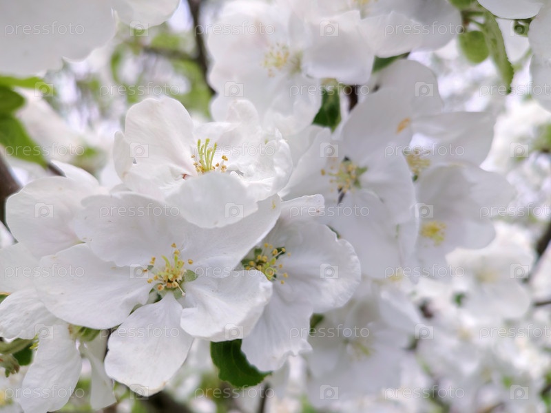 Крупный план дерева с белыми цветами. Цветы маленькие и нежные, и на дереве их полно. Понятие красоты и спокойствия, поскольку белые цветы являются символом чистоты и невинности