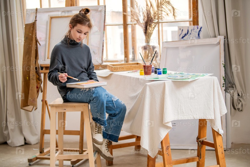 Девушка рисует картину на холсте. На ней фартук, в руке у нее кисть. Картина красочная и живая, с сочетанием зеленых и синих оттенков