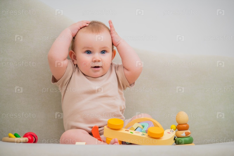 Ребенок сидит на диване, а перед ним игрушечный грузовик. Он улыбается и машет руками