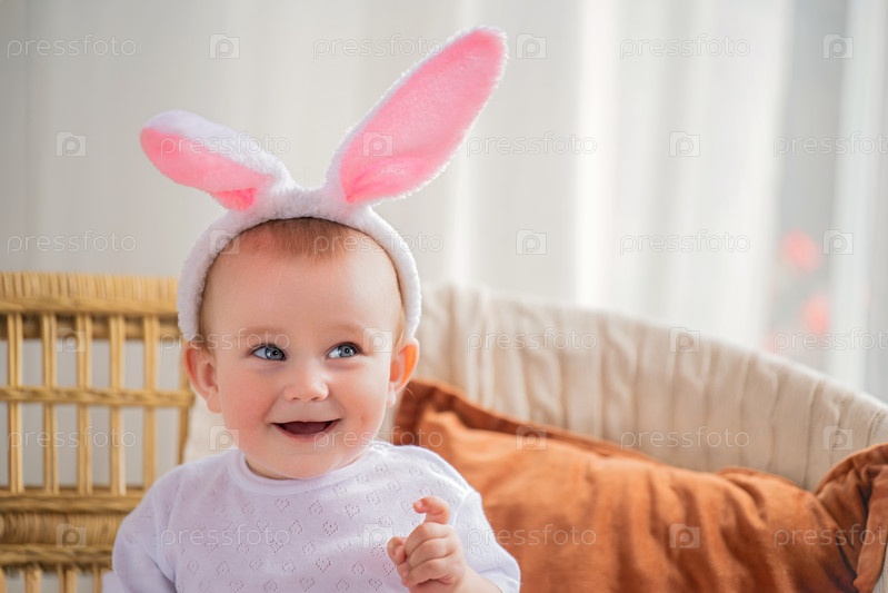 Ребенок в шапке кролика улыбается в яркой солнечной комнате