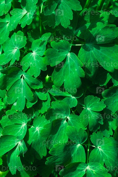Красивый зеленый фон из листьев водосбора, аквилегия для полного кадра, макро