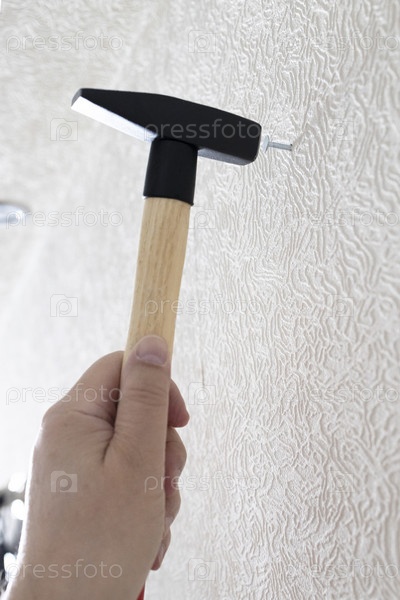 Рука с молотком забивает гвоздь в белую стену