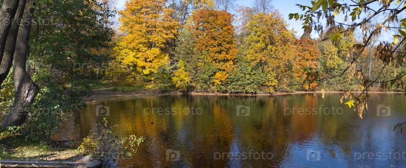 Осенний пейзаж, цветные деревья над озером с утками, красивый живописный фон. Природные краски. Прекрасный вид. Панорамным горизонтальный кадр