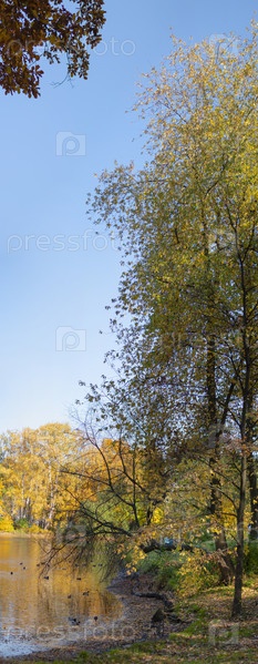 Осенний пейзаж, цветные деревья над прудом с утками, красивый живописный фон. Природные краски. Прекрасный вид. Вертикальный кадр. Вертикальная панорама