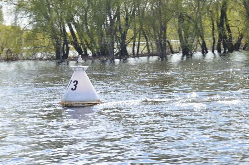 Чайка сидит на речном буе в солнечный весенний день