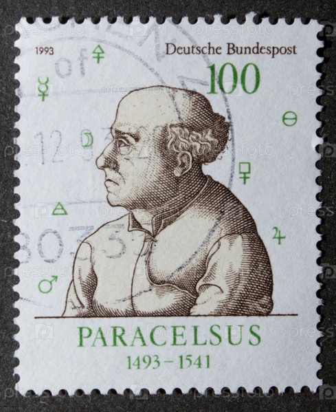 Почтовая марка ФРГ 1993 года. Парацельс (493-1541) швейцарский алхимик, врач, философ, естествоиспытатель. 500 лет со дня рождения врача. Марка с гашением
