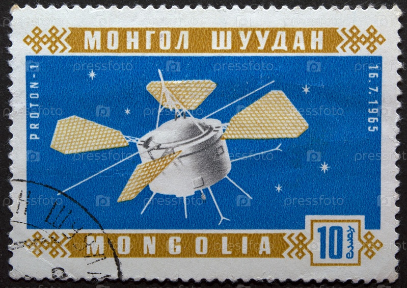 Почтовая марка с выпуском Монголия 1965 год. Протон 1. Советский тяжелый научный спутник Протон Запуск на околоземную орбиту 16.07.1965 с космодрома Байконур