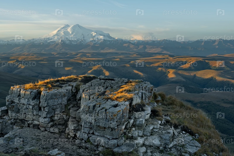 Россия, Приэльбрусье. Потрясающий восход солнца на скалах плато Большой Бермамыт на фоне горы Эльбрус