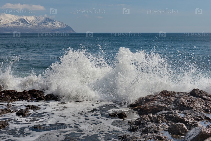 Россия. Дальний Восток. Курильские острова. Бьющиеся о базальтовые скалы волны Тихого океана на берегу острова Итуруп
