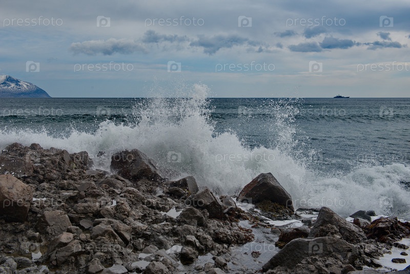 Россия. Дальний Восток. Курильские острова. Бьющиеся о базальтовые скалы волны Тихого океана на берегу острова Итуруп