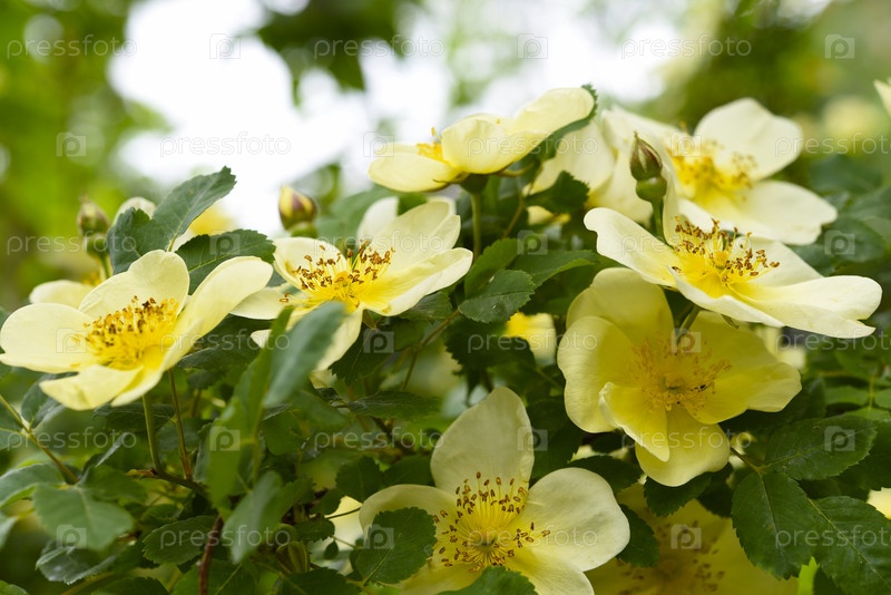 Желтые цветы шиповника в весеннем саду. Группа красивых желтых цветов