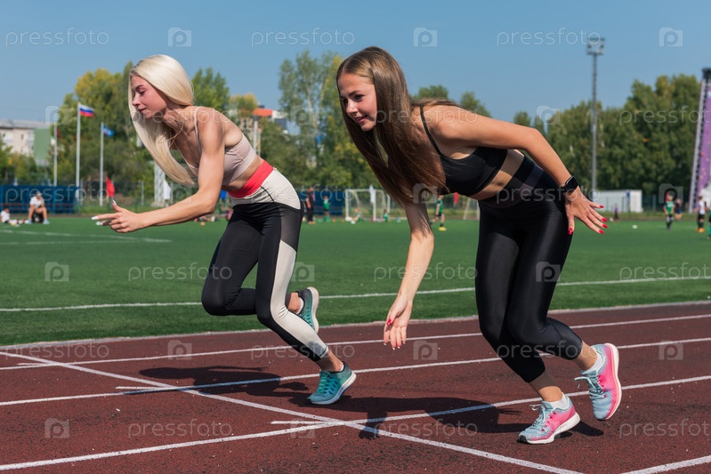 Две спортсменки-бегуны на стадионе на открытом воздухе