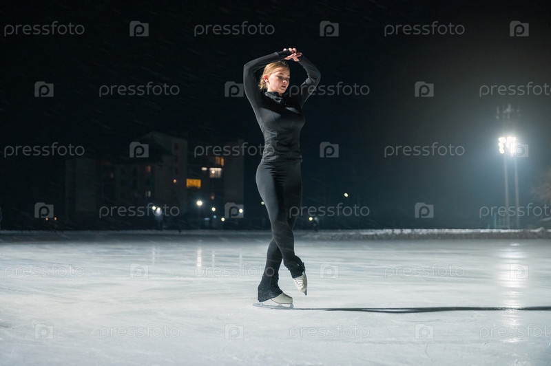 Красивая молодая женщина катается на коньках и выполняет короткую программу