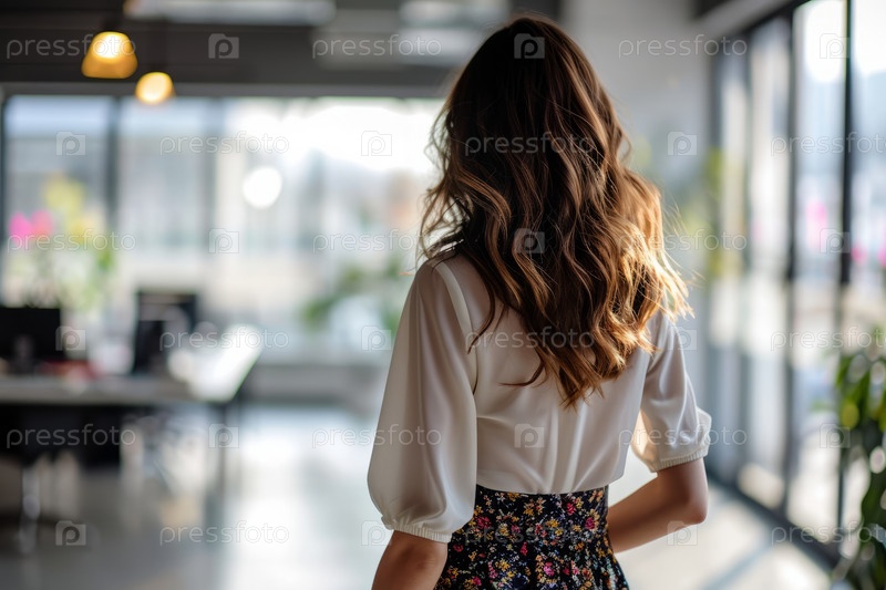 Вид сзади на молодую деловую женщину в юбке в современном офисе на заднем плане