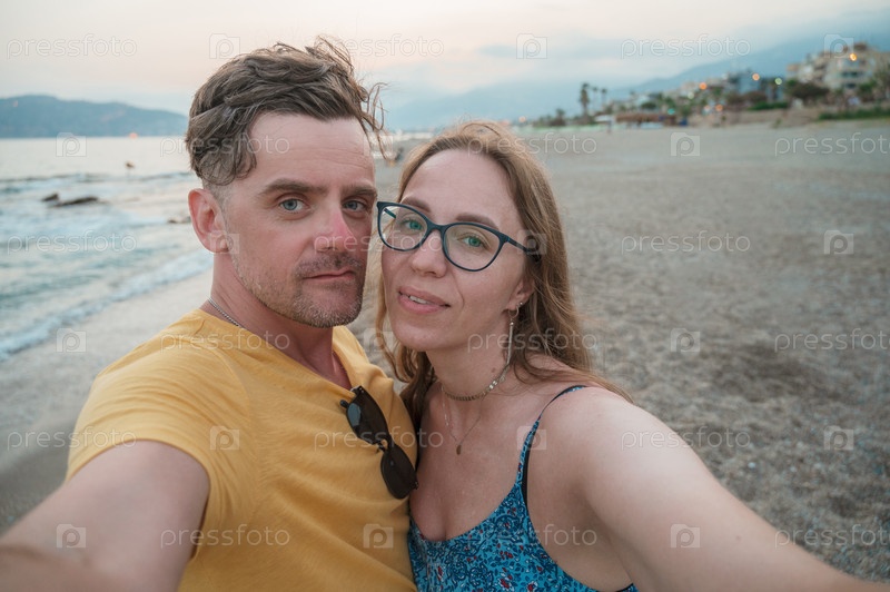 Счастливая пара фотографируется на пляже