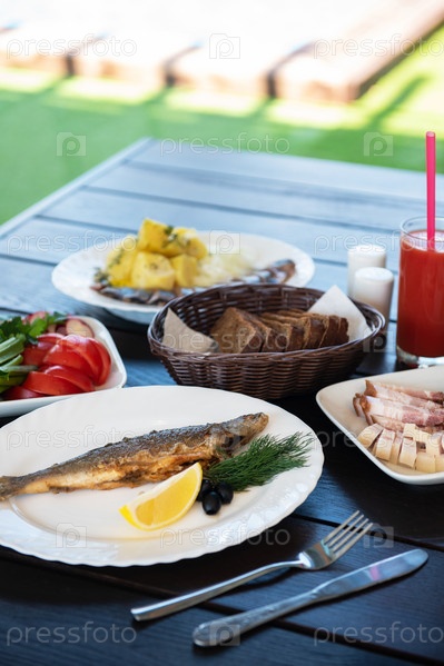 Жареная рыба хариуса на тарелке с закусками на фоне бассейна. Концепция отдыха и релаксации