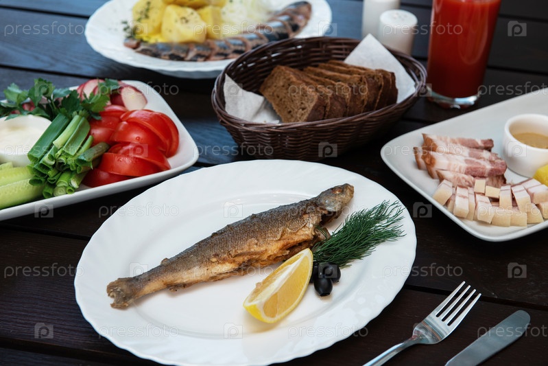 Жареная рыба хариуса на тарелке с закусками на фоне бассейна. Концепция отдыха и релаксации