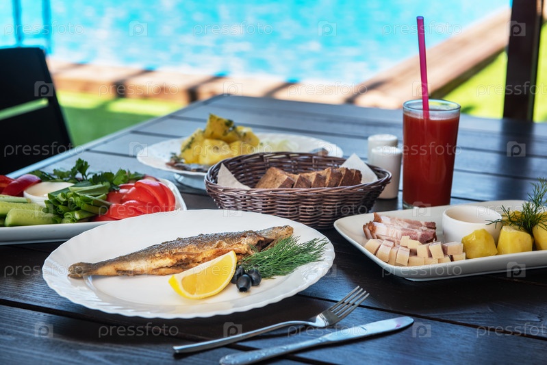 Жареная рыба хариуса на тарелке с закусками на фоне бассейна. Концепция отдыха и релаксации