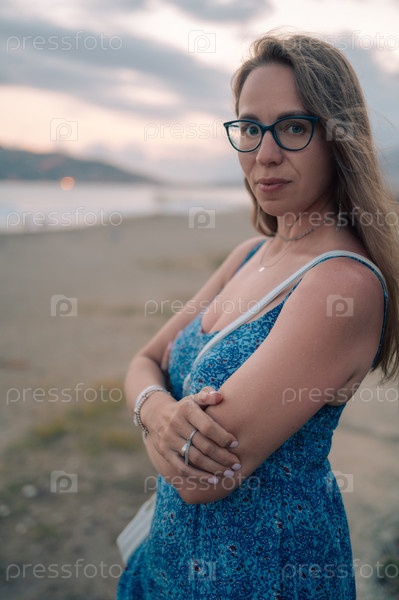 Женщина сидит на пляже и смотрит на море в городе Алания