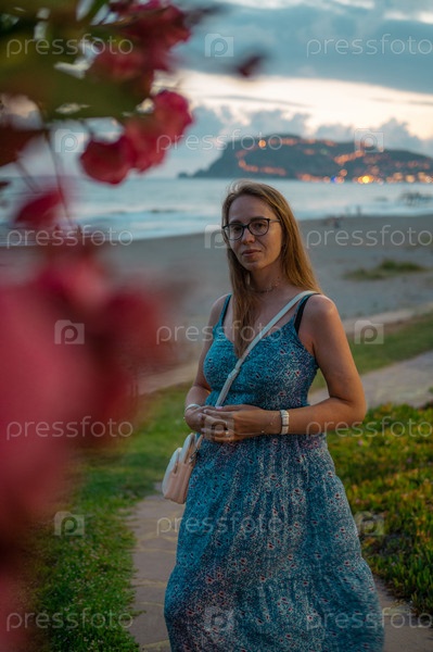 Женщина сидит на пляже и смотрит на море в городе Алания, Турция. Концепция путешествия или отпуска