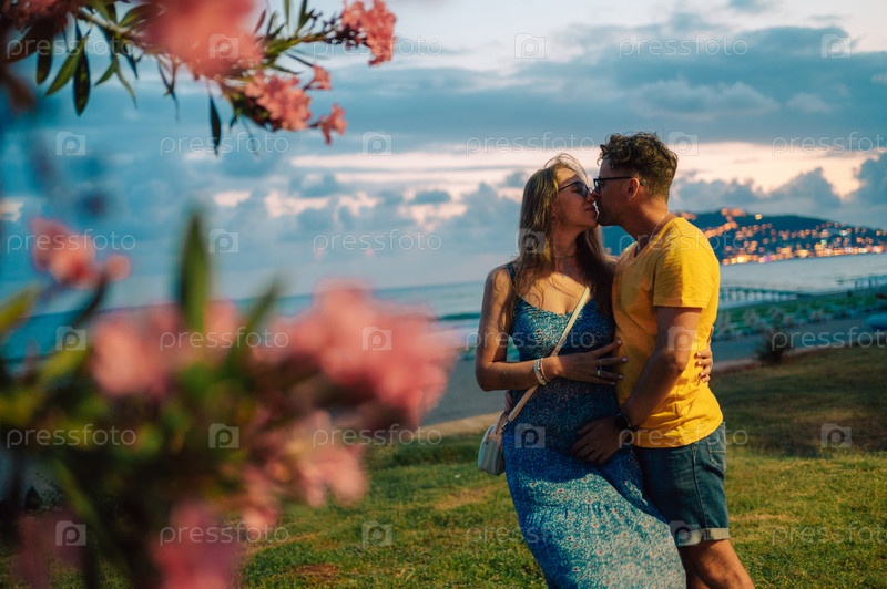 Счастливая пара фотографируется на пляже