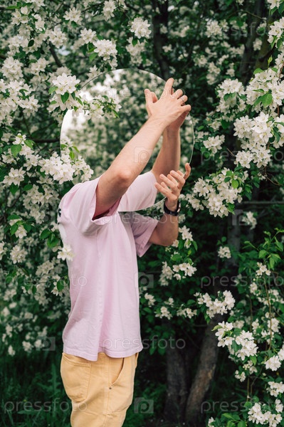 Творческий мужской портрет с зеркалом в весеннем саду цветущих яблок