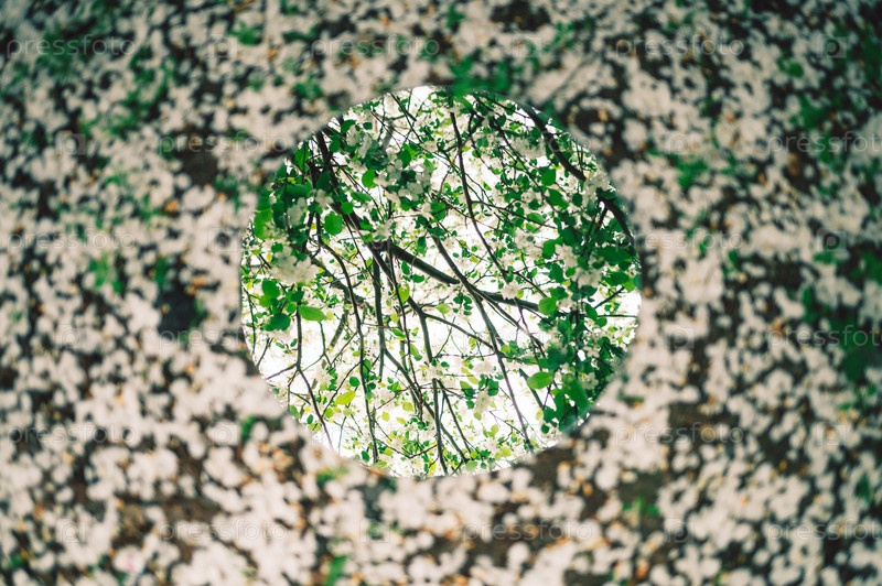 Концепция природы и флоры - крупный план отражения цветков яблони в круглом зеркале