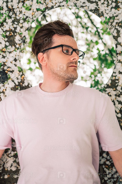 Творческий мужской портрет с зеркалом в весеннем саду цветущих яблок