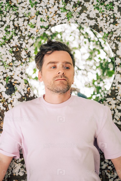 Творческий мужской портрет с зеркалом в весеннем саду цветущих яблок