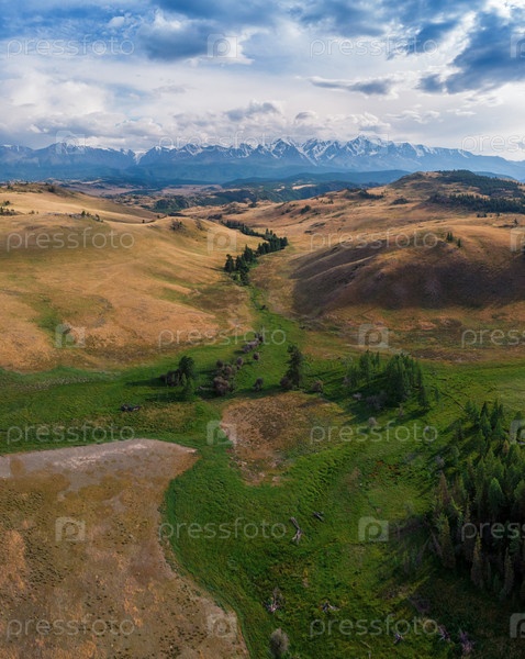 Курайская степь и река Чуя на фоне гор Северо-Чуйского хребта. Горный Алтай, Россия. Панорамное изображение с воздушного дрона