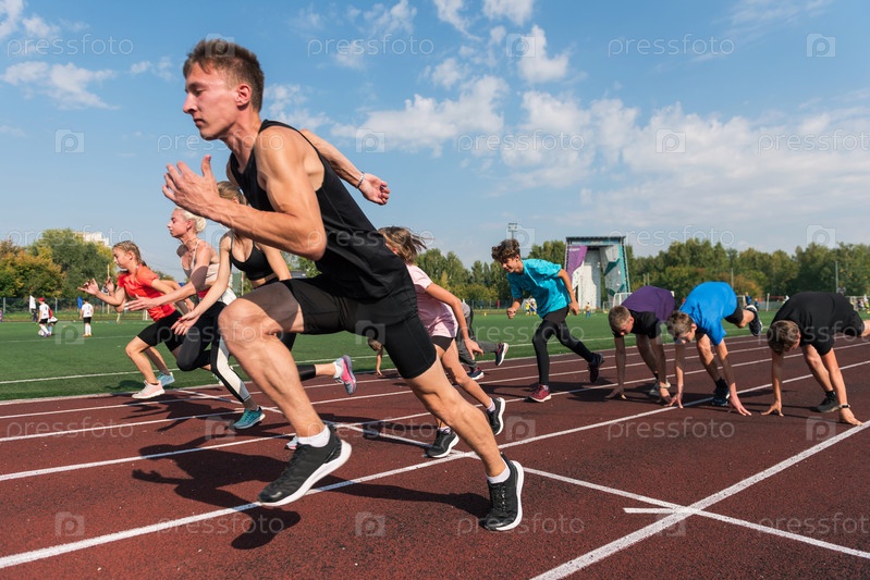 Группа молодых спортсменов-бегунов тренируется на стадионе на открытом воздухе