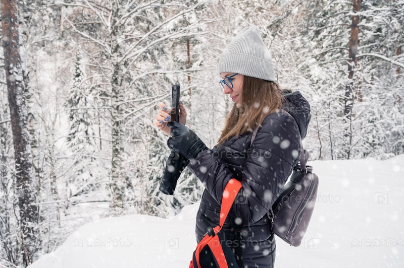 Женщина фотографирует на телефон в заснеженном зимнем лесу, снежный зимний день