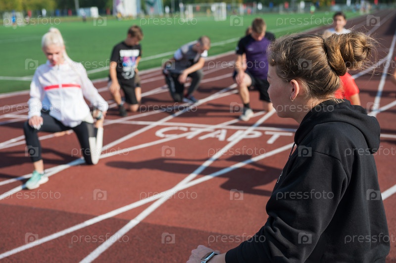 Тренер-женщина и группа детей проводят тренировку на стадионе. Школьные физкультурные тренировки или легкая атлетика