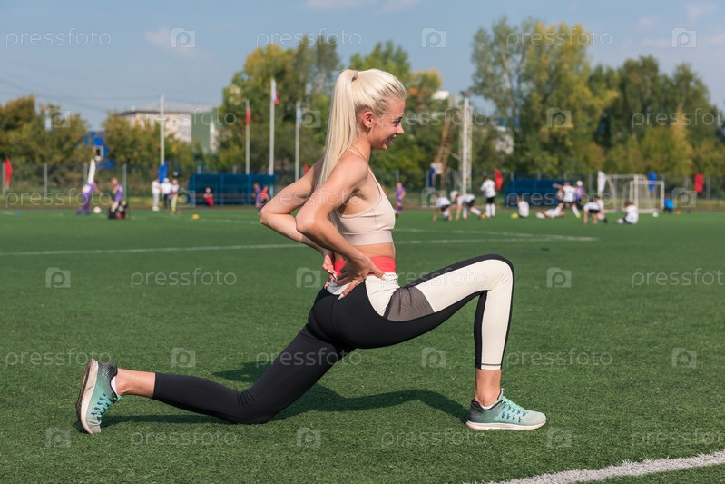 Молодая спортивная женщина в спортивной одежде растягивается на стадионе